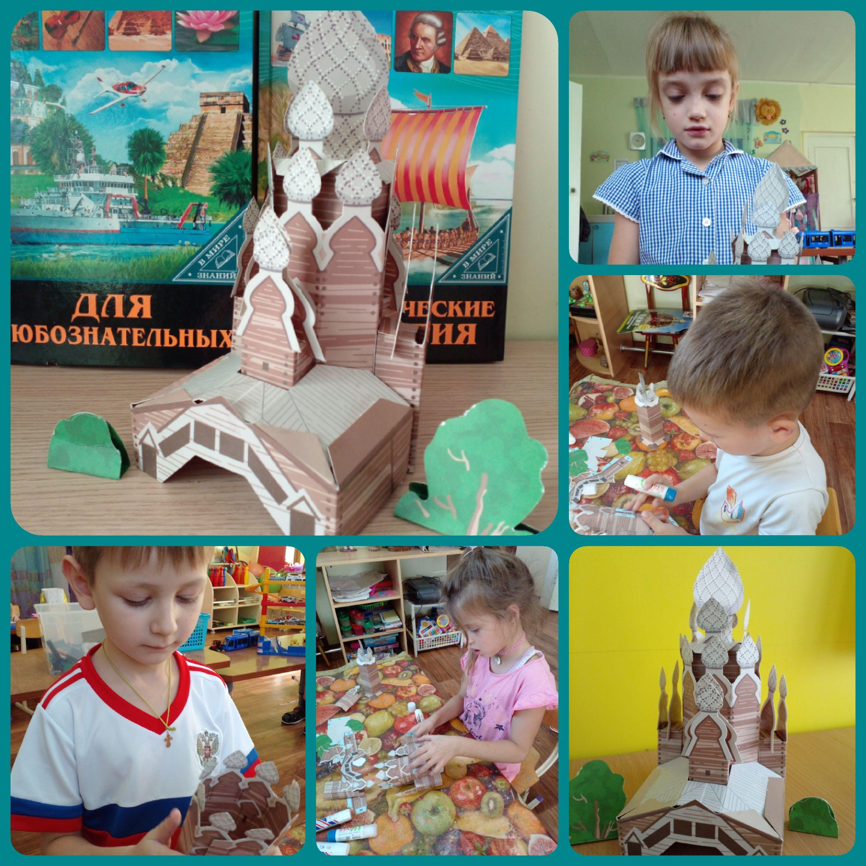 Познакомились с одним из чудес России, Преображенской церковью в музее-заповеднике "Кижи" и выполнили коллективное конструирование макета церкви.